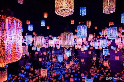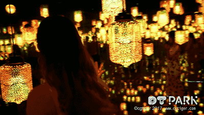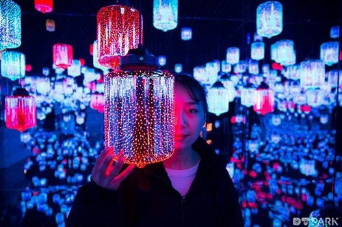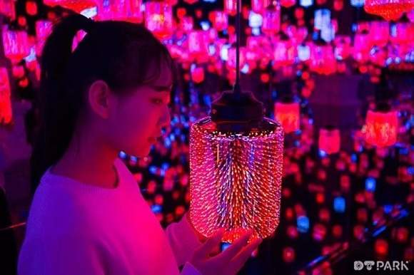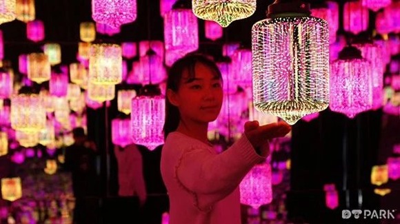 在『夢幻迷鏡』里,幾千盞燈散發著色彩各異的光,明亮而溫馨地照耀穿梭其中的每一張面孔。在這里,數字空間和實體空間相融合,房間的地面和墻面都像鏡子一樣能夠反射光線,投影著燈盞的形態和顏色,營造了如夢如幻的沉浸式體驗。