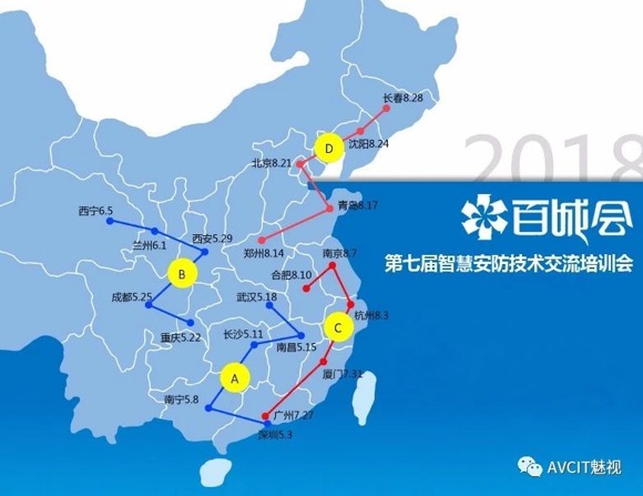 本屆“百城會”將在全國20個城市舉行,分東(C)、南(A)、西(B)、北(D)四條線路。