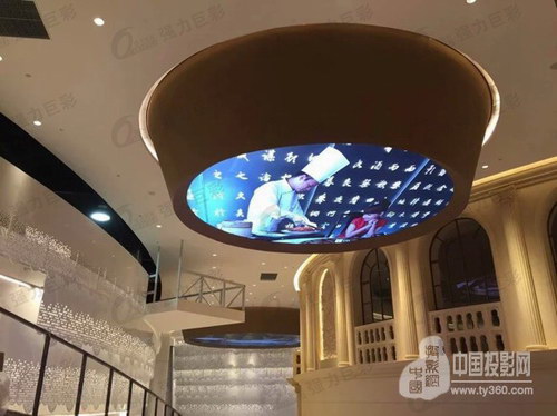 在酒店大堂,強力巨彩室內全彩大屏環形吊裝,快速提升酒店格調