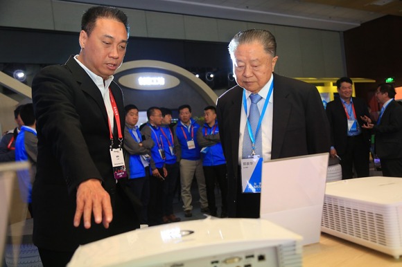 Vivitek(麗訊)亞太暨大中華區(qū)總經(jīng)理施彥名博士向臺(tái)達(dá)集團(tuán)創(chuàng)辦人鄭崇華先生介紹Vivitek(麗訊)投影機(jī)