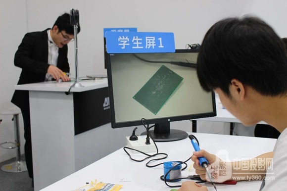 在智慧實訓空間里,老師正在進行電路焊接演示,講臺桌上的攝像機將老師示范畫面實時傳輸到學生的顯示屏上。學生無需圍在老師身邊,也能清晰看到示范的操作細節。演示結束后,坐在工位上的2名學生進入實操環節,專注地進行電路焊接。每個工位的攝像機將學生焊接的特寫畫面,顯示在老師的屏幕上。