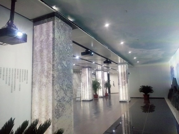 理光PJ LU8000是理光高端紅藍雙色激光工程投影機,8500流明的亮度和12000:1的超高對比度,高清分辨率為1920*1080,可實現更高色彩的還原性和表現力。數字沙盤采用L型的展示結構,正面墻上畫面由4臺PJ LU8000投影機融合組成,每臺8000流明的高亮度使得16m×3.6m的畫面得以完美實現。地面上是由20臺PJ LU6000投影機,加上超短焦鏡頭,融合組成一個16m×14m的超大地幕。通過服務器控制,整個展項可以進行同步互動,是展館內一個重要亮點。