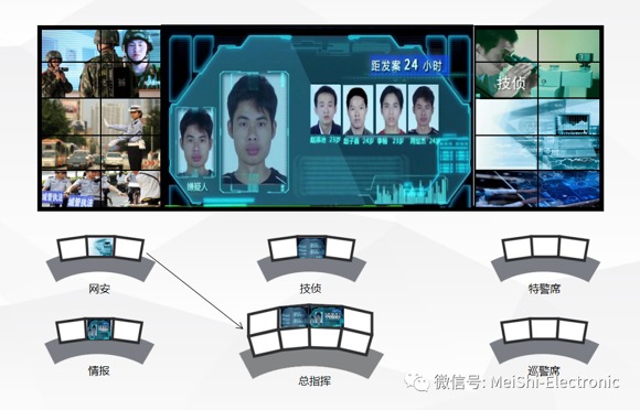 ● 移動指揮車將實時畫面推送給指揮中心進行情況分析后,快速決策將警力分為三個部分進行作戰:外圍警戒(避免無關人員誤入現場)、情報偵查(飛機結構,嫌疑人情況,人質情況等)、武力突擊抓捕三隊進行作戰(伺機而動,進行抓捕)。在指揮車內部將現場畫面,指揮中心畫面等畫面在車內拼接屏上進行任意分割顯示,便于現場指揮;