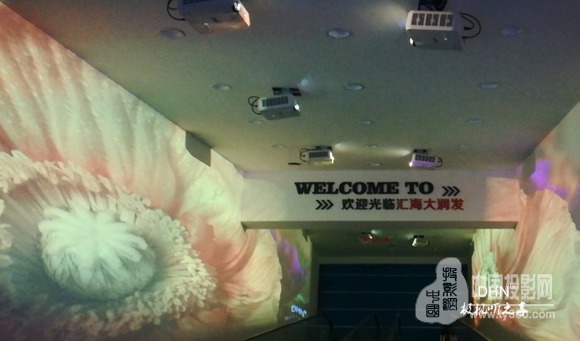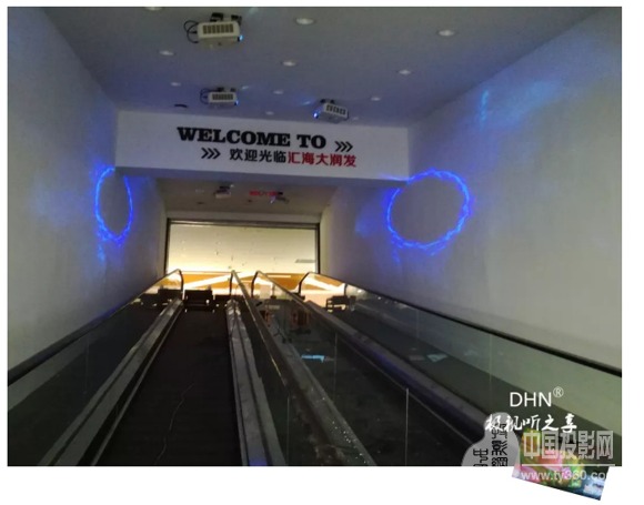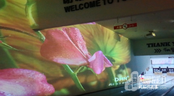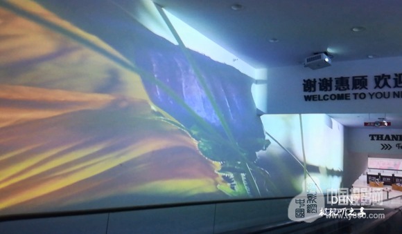 為支持每天長達7小時以上的營業時間,不同時間段展示不同主題,采用10臺DHN-DM350X短焦投影機,分別搭配2臺迪碩(DISO)- DK517、 DW705-3純硬件邊緣融合器,在電梯兩邊墻面分別投16:3投影畫面,并放映同期主題片源,搭配其他附件,整體實現左右墻面聯動。當顧客入超市前,駐足的同時即可視界享受。