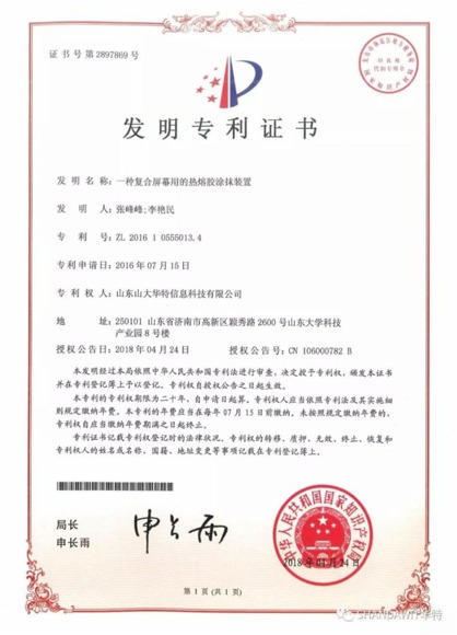 經國家知識產權局審查,我公司申請的“一種復合屏幕用的熱熔膠涂抹裝置”于2018年4月24日被授予發明專利權,專利號:ZL201610555013.4,專利權自授權公告日起生效,有效期二十年。