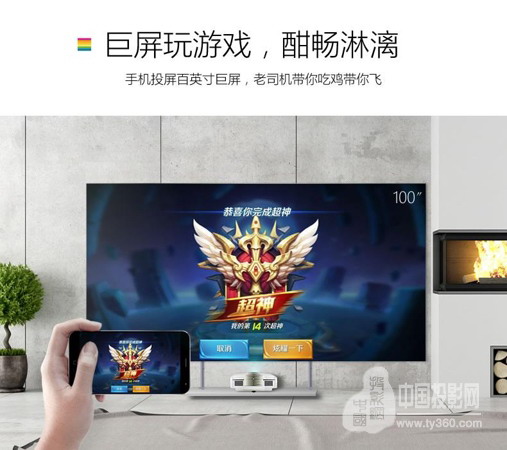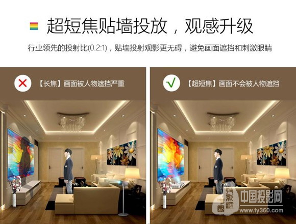 4、超高投射比(0.2:1),放在電視柜上即可投射100+寸畫面。