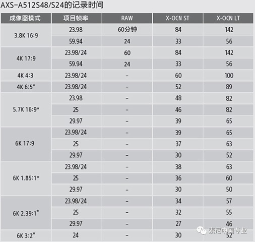 X-OCN格式在CineAltaV攝影機上的記錄時間