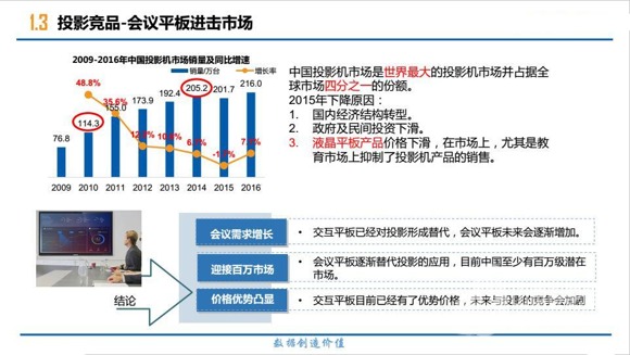 (3)投影儀地位下降,會(huì)議平板逐漸替代投影的應(yīng)用,并呈現(xiàn)高速成長(zhǎng)的趨勢(shì),據(jù)估算,目前中國(guó)至少有百萬級(jí)潛在市場(chǎng)。