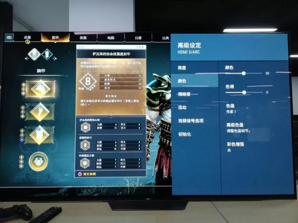 在選擇電視的“游戲”模式后,在“顏色”選項里,有一個“高級設定”,在高級設定下有色溫的選擇,大家注意里面默認的“專家1”模式,說明A8F在出廠前,默認設置中已經為大家預設了非常精準的色彩模式了。