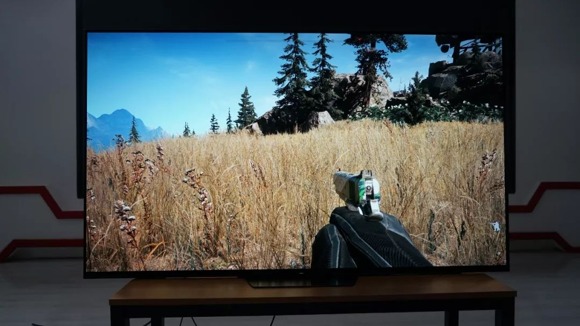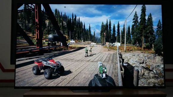 我們還試了試育碧的《孤島驚魂5》,在效果全開的狀態下,天空中云層的表現十分自然,《孤島驚魂5》在植物以及水的細節表現令人滿意。在天空向下急速滑行時不會出現低端電視會有那種模糊拖延感,因為《孤島驚魂5》是一款FPS游戲,作為主體的槍械和載具能在高速下落中保持很高的清晰度,讓畫面主謂分明,能給玩家非常的好指向性和方位感。