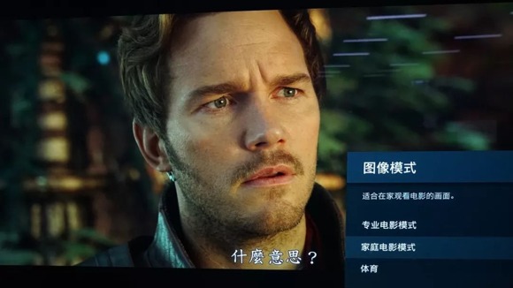 在播放電影的時候有兩種模式可選,專業電影模式和家庭電影模式,專業電影模式特別針對適合膠片內容的畫面,追求對電影畫面的最高還原度,適合在暗室環境開啟,家庭電影模式則對電影畫面進行了更多的聲光渲染,即便是在明亮環境下也可以得到影院級的體驗,對待4K HDR片源時,我們發現采用專業電影模式可以獲得更為逼真的畫面效果,下面是我們用測試碟4K版《銀河護衛隊2》藍光碟進行試機時的實拍畫面。
