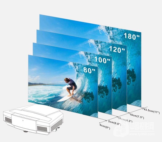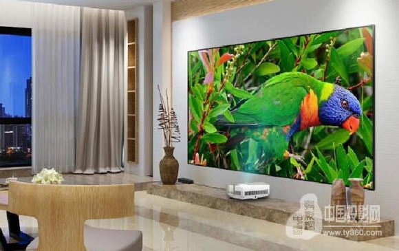 超短焦投影電視之所以受大眾青睞,除了可投射超大畫面,其次安裝方便也是重要因素,放置在電視柜上即可投射出超大畫面,畫面的大小取決于投影機距離墻壁的距離,距離墻面越遠,投射的畫面也就越大,用量化的數字就是投射比,投射比=投射距離/畫面寬度。這里說明一下,我們平時稱投影畫面的長度為寬度,寬為高度,所以不要理解錯了。其實投射不僅僅只是一個定義那么簡單,它可以折射出這些年投影技術的變化,從最早的長焦投影機到短焦投影機,再到如今的超短焦投影機,投射比越來越小,這讓投影機的應用范圍更為廣泛,并慢慢進入大眾消費者的家庭。