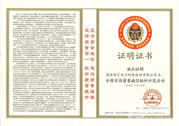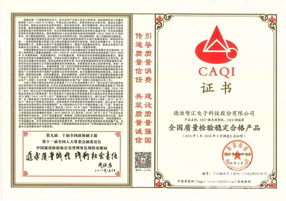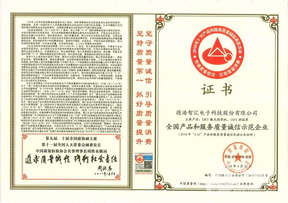 近期,DET德浩在中國質量檢驗協會舉辦的“2018年“3.15”國際消費者權益日“產品和服務質量誠信承諾”活動中,榮獲“全國百佳質量誠信標桿示范企業、全國產品和服務質量誠信示范企業、全國質量檢驗穩定合格產品”榮譽證書。