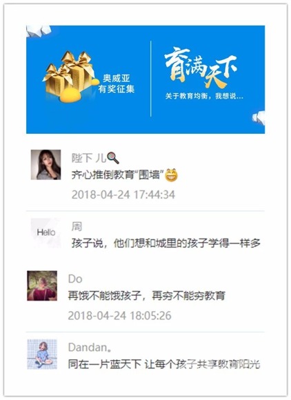 1999年,一部電影《一個都不能少》賺足了大眾的眼淚,其反射的中國鄉村教育問題時至今日依然值得我們深思。2018年,奧威亞始終致力于讓每個孩子都能享有公平而有質量的教育資源,并在4月24日-5月2日,通過線上征集教育均衡感言,得到眾多教育工作者的積極響應。