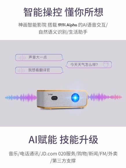 神畫Q1獨有的隔空觸控技術,開創了人工智能交互在投影操作上的先河,遙控器就像手指,可以遠距離對畫面進行點擊、滑動、拖曳、放大等操作,就像玩ipad一樣便捷。此次,神畫與京東Alpha深度合作,在遙控器上植入AI語音,這下子,動動嘴就能完成一系列操作。
