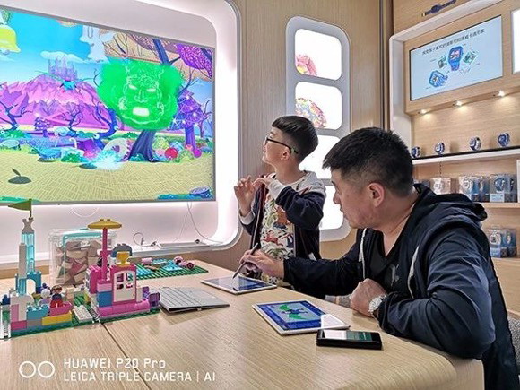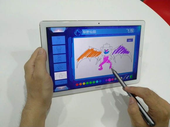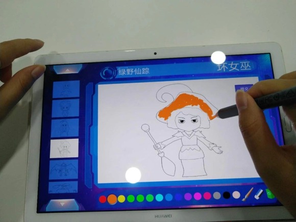 在兒童體驗區,家長和小朋友們坐在一起,拿著華為PAD給選好的角色涂色。他們盡情發揮想象力,用多彩的顏色讓自己的圖案與眾不同。不一會兒功夫,桃樂絲、鐵皮人、小獅子等故事人物就色彩艷麗地出現屏幕上。