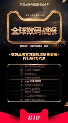 根據(jù)生意參謀官方數(shù)據(jù)顯示,截止6月18日23時59分,jmgo堅果旗艦店位列辦公設(shè)備行業(yè)TOP 1,成為618當天的冠軍。