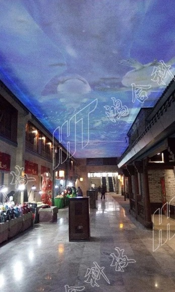 整個地下天幕街長210米,寬8米,高10米。視頻圖像由21臺NEC NP-PX1004U+激光投影機投射到天花板,并使用專業的圖像拼接處理軟件,組成一個210長,8米寬的巨幅畫面,圖像內容有時是蔚藍的天空,加上朵朵飄揚的白云;有時是絢麗的煙花齊放,渲染得五彩斑斕的夜晚;有時是清澈的海底,各種魚類在漫步暢游,給步行在天幕街的游客一種身臨其境的感受,體現出多媒體展示帶來的科技感。
