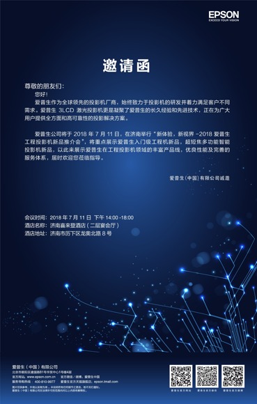 就在7月11日下午14:00-18:00,愛普生工程機新品推介會濟南站將在濟南喜來登酒店正式開幕!愛普生全新激光工程投影機產品等待您的到來,歡迎各位蒞臨指導。