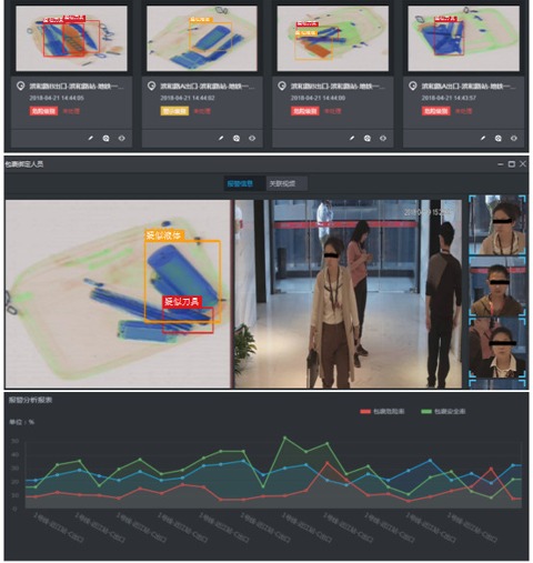 中心管理平臺,實時接收違禁品報警并聯動現場視頻錄像,實現實時管控安檢現場情況。同時,對過包人員進行人臉抓拍比對,實現人包合一,嫌疑人員報警,將傳統的物檢與人檢有效結合。平臺還具備數據統計分析功能,通過對每日過包數據的統計,分析出過包量及危險物品量,為安檢人員和警務人員的調配提供輔助信息,實現安檢智能化管理。