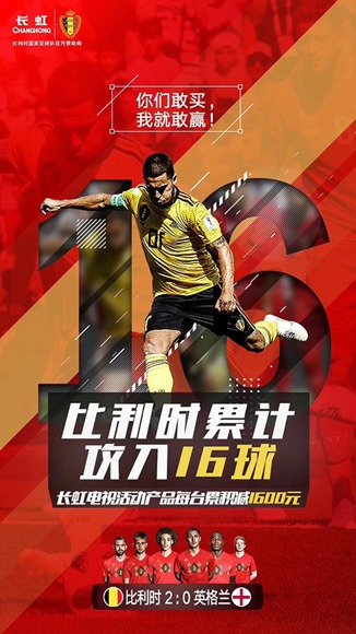 賽事營銷中,企業選擇合作球隊如同押寶,球隊成績好是運氣,如果成績不好,總有難言的遺憾。可長虹與比利時隊的聯姻,從一開始就拿到了宣傳優勢。何況比利時隊在本屆世界杯中取得7戰6勝的佳績,接連打敗巴西、英格蘭等老牌勁旅,小組賽積分高居小組第一,伴隨著比利時隊一路過關斬將,長虹的借勢海報和相關話題連續數日在社交媒體刷屏,再次提升了品牌傳播效果。