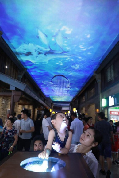 天幕輪換播放蔚藍的海底世界、綻放的絢麗煙花、浩瀚無垠的星空,編織出五彩繽紛的迷人夏夜,吸引眾多市民駐足欣賞拍照。一邊逛街購物,一邊欣賞新奇有趣的投影天幕,已成為市民和游客的一種全新旅游休閑娛樂方式。