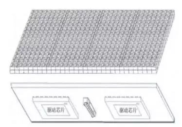 板上封裝(Chip on Board)是一種將多顆LED芯片直接安裝在散熱PCB基板上來直接導(dǎo)熱的結(jié)構(gòu)。COB封裝集合了上游芯片技術(shù),中游封裝技術(shù)及下游顯示技術(shù),因此COB封裝需要上、中、下游企業(yè)的緊密合作才能推動(dòng)COB LED顯示屏大規(guī)模應(yīng)用。如上圖所示,為一種COB集成封裝LED顯示模塊,正面為LED燈模組構(gòu)成像素點(diǎn),底部為IC驅(qū)動(dòng)元件,最后將一個(gè)個(gè)COB顯示模塊拼接成設(shè)計(jì)大小的LED顯示屏。