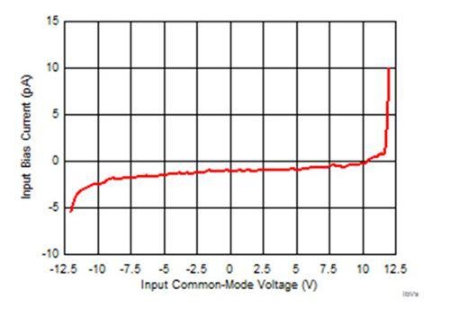 圖1:OPA2810具有輸入共模電壓的偏置電流變化