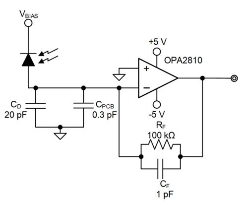圖2:帶反饋補償電容的光電二極管跨阻放大器電路