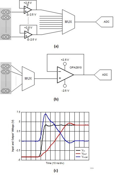 圖4:具有多個慢速建立放大器的多通道傳感器前端(a);使用單個OPA2810進行快速建立(b);使用OPA2810的大信號瞬態響應(c)