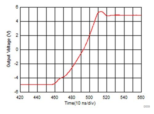 圖4c顯示了在OPA2810的同相輸入端施加8V階躍時的輸出電壓和輸入差分電壓,OPA2810是圖4b中所配置的一個單位增益緩沖器。