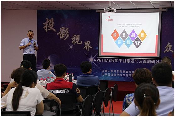 投影視界,眾贏未來!8月15日,VVETIME投影手機渠道北京戰略研討會在北京凱昆集團順利召開。深圳眾贏時代科技有限公司領導、多名營銷中心高級教練團隊成員與來自社會各界近百名精英人士,共同探討眾贏時代創新戰略渠道模式,為這個炎熱的夏天掀起一場投影風潮。