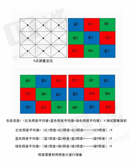 關于色彩亮度的測量,需要分別測試NTSR,NTSG,NTSB 測試圖樣中(9點測量)每個色塊中心點照度值的平均值,與測試圖像的面積相乘,即得到色彩亮度。具體測量和計算方法參考下圖: