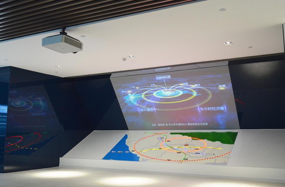 穿過(guò)紗幕走廊,我們來(lái)到了氣勢(shì)更滂沱的大浪時(shí)尚小鎮(zhèn)規(guī)劃展區(qū),首先映入眼簾的方案是1臺(tái)VPL-F430HZ創(chuàng)造的異形方案,投影畫(huà)面與燈帶地圖形成一個(gè)向內(nèi)折角,仿佛一張巨型卡片徐徐打開(kāi);展現(xiàn)了小鎮(zhèn)卓越的地理位置——地處深圳中軸核心,商業(yè)影響力遍及廣州、東莞、汕尾等重要城市;燈帶地圖描繪了陸、海、空立體交通網(wǎng)為小鎮(zhèn)帶來(lái)的區(qū)位優(yōu)勢(shì)。