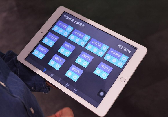整個(gè)項(xiàng)目由深圳建業(yè)的合作伙伴深圳藝博堂設(shè)計(jì)施工一體化完成,不僅創(chuàng)造了豐富、精彩的大畫(huà)面投影方案,還打造了專業(yè)控制系統(tǒng)。我們看到,通過(guò)平板電腦上清晰直觀的操控界面,即可輕松控制展廳中的影像、燈光、音響、內(nèi)容播放等硬軟件設(shè)備,讓客戶獲得更好使用體驗(yàn)。
