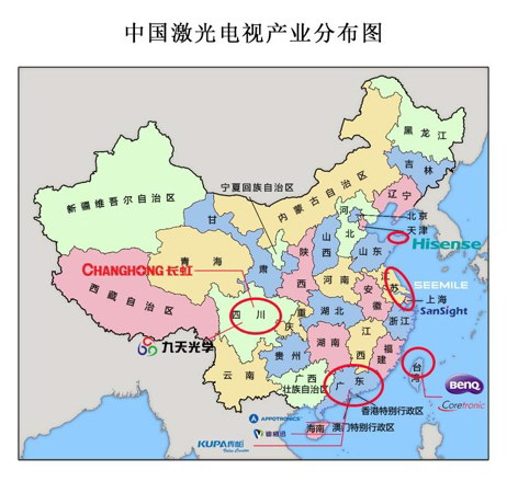 激光顯示技術符合“中國制造2025“戰略,未來極有可能由中國品牌引領全球激光顯示產業發展。中國市場具備激光產業發展的兩大要素:較為完善的產業鏈和龐大的消費人口。讓我們來看一下目前國內激光電視產業分布情況。
