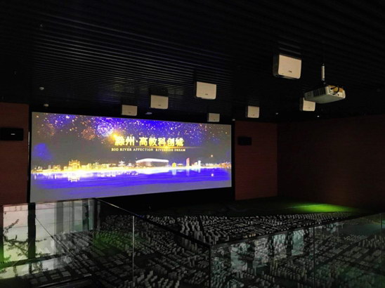 滁州高教科創城利用數字沙盤和融合投影主屏幕向觀眾直觀展示科創城布局及規劃。展示廳共采用了10臺CR5450HL激光投影機,其具有4500流明高亮度與1920*1080全高清分辨率。展示廳中央由2臺CR5450HL采用正投融合的方式,將科創城未來繁榮發展景象投射在巨幅屏幕上,與地面8臺激光投影機融合投射出的沙盤交相呼應,加以CR5450HL激光光源的非凡色彩表現力和融合拼接中色彩的一致性,把未來科創城鳥瞰圖生動地搬到了參觀者的面前,并伴隨著立體聲效解說營造出能讓人身臨其境的參觀體驗。