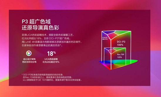 眾所周知,好萊塢的電影工業(yè)均采用P3色域作為電影色彩標準,為了更好的還原電影的色彩,蘋果、三星最新的旗艦手機也都遵循了這一標準。而得益于LUNE 4K的原彩色輪以及遠心架構設計,LUNE 4K也達到了P3廣色域。觀看電影的時候,LUNE 4K可以顯示出更加豐富的顏色,讓畫面更具層次感,比如在播放日出畫面的時候,它可以很好的展現(xiàn)出不同階段不同距離下日光的細微變化。