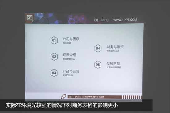 對一部分有會議升級需求的企業來說,分辨率更高清的投影機也值得考慮。簡報中常出現的圖表視頻內容,將會隨分辨率提升實現畫質明顯提升,文字也會變得更銳利一些,適合空間較大或者開會人數較多的會議,高清投影機保證身處角落也能清楚觀看簡報內容。
