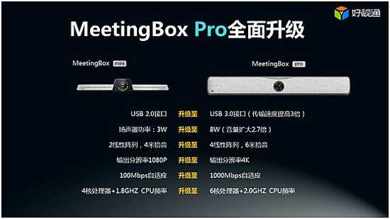 自16年底齊心好視通發布了首款一體化云會議智能硬件MeetingBox Mini,讓召開視頻會議如同打電話般簡單,一經推出,立即引起熱議與追捧,而齊心好視通并未停下探索更多新技術的腳步,時隔兩年后,帶著其全新升級產品——MeetingBox Pro閃耀面世。和前一代產品相比,MeetingBox Pro延續了其高度智能一體化的設計,但在硬件上做了不小的升級改變,將六大硬件進行了全面升級,力求打造出更好的視頻會議體驗。