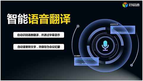 智能語音字幕及翻譯:自動識別語音,并通過字幕顯示;自動語音轉文字及自動翻譯,并保存為會議紀要。