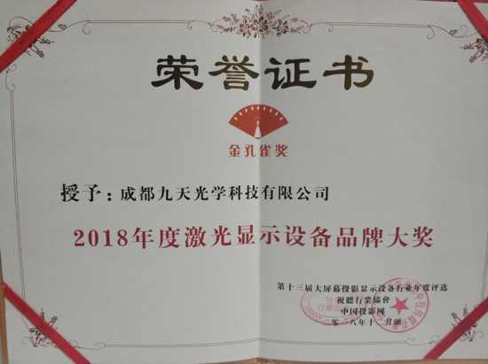 “激光顯示設備評選活動”作為業(yè)內權威的活動之一,評選長達70天,經由廠家自薦、業(yè)界精英、行業(yè)媒體投票、專家學者評審等環(huán)節(jié),參考指標囊產品研發(fā)實力、行業(yè)知名度、市場占有率、用戶滿意度等多項,綜合評定后誕生終選名單,而這無疑是對獲獎企業(yè)品牌綜合實力的最高肯定。九天光學以豐富的激光投影光機產品線、自主研發(fā)能力、核心專利、優(yōu)秀的技術解決方案,獲得“2018年度激光顯示設備大獎”。