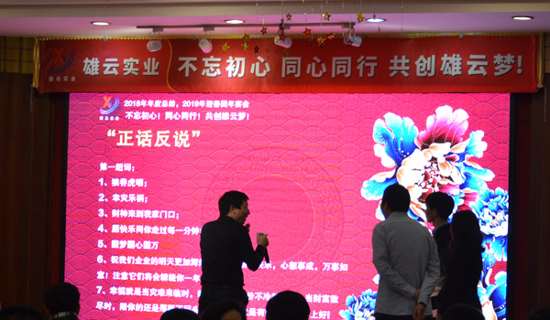秦文君董事長上臺祝酒,引來全場陣陣掌聲!秦總說:“大家新年好”, 全體人員說:“好、很好、非常好,不忘初心!同心同行!共創雄云夢”;聲音震耳欲聾、久久回響!