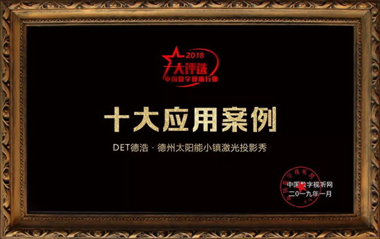 憑借著實力,更靠著2018年大家有目共睹的成績,DET榮獲數字視聽網《十大典型應用案例獎》(德州太陽能小鎮激光投影秀)、中國投影網2018年度評選《投影顯示優秀品牌獎》,2018年度投影機品牌大獎,連續獲獎,代表了行業專家對DET德浩產品及品牌的高度認可,彰顯了民族品牌的實力,肯定了DET德浩在投影行業的努力。