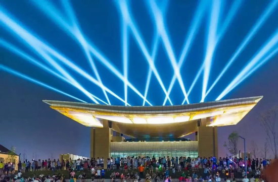 競賽主場館 “光明閣”, 這棟建筑按照“凌云高閣、大國重器”的理念,參照上海世博會中國國家館的樣式進行建造。夜間,這頂“古帽”變成了大屏幕,一幀幀栩栩如生的畫面清晰地出現在屏幕上,配合著音樂、燈光、影像,為市民帶來一場投影燈光秀表演,成為德州市民的網紅打卡圣地。