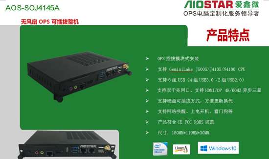 愛鑫微電子(AIOSTAR)是國(guó)內(nèi)OPS電腦產(chǎn)品線最全的研發(fā)、生產(chǎn)、銷售為一體的廠家,同時(shí)提供OEM/ODM定制服務(wù),目前主產(chǎn)品線為: