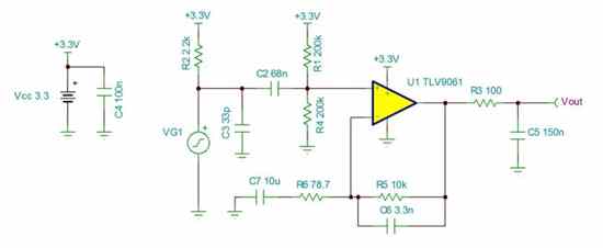讓我們來看一個電路的示例設計,用于+ 3.3V電源,輸入為7.93mVRMS,輸出信號為1VRMS。7.93mVRMS對應于具有麥克風的0.63Pa聲級輸入和-38dB聲壓級(SPL)靈敏度規格。帶寬目標是將300Hz的常見語音頻率帶寬傳遞到3kHz。