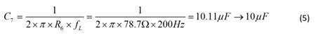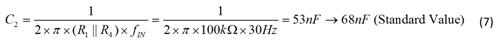 要將輸入信號截止頻率設置得足夠低以使低頻聲波仍能通過,請選擇C2以實現30Hz截止頻率(fIN)(公式7):