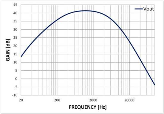 圖2顯示了麥克風前置放大器電路的測量傳遞函數。由于高通濾波器和低通濾波器之間的窄帶寬和衰減,平帶增益僅達到41.8dB或122.5V / V,略低于目標。