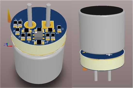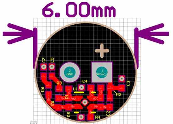 采用TI的X2SON封裝技術將電路安裝到6mm直徑駐極體麥克風的背面。由于安裝尺寸限制,需要采用非常小的運算放大器:TLV9061的占位面積僅0.8mm×0.8mm。此外,0201小尺寸電阻和電容最大限度地減小印刷電路板(PCB)面積,您也可以采用更小的電阻來進一步減小該面積。印刷電路板布局如圖3和圖4所示。
